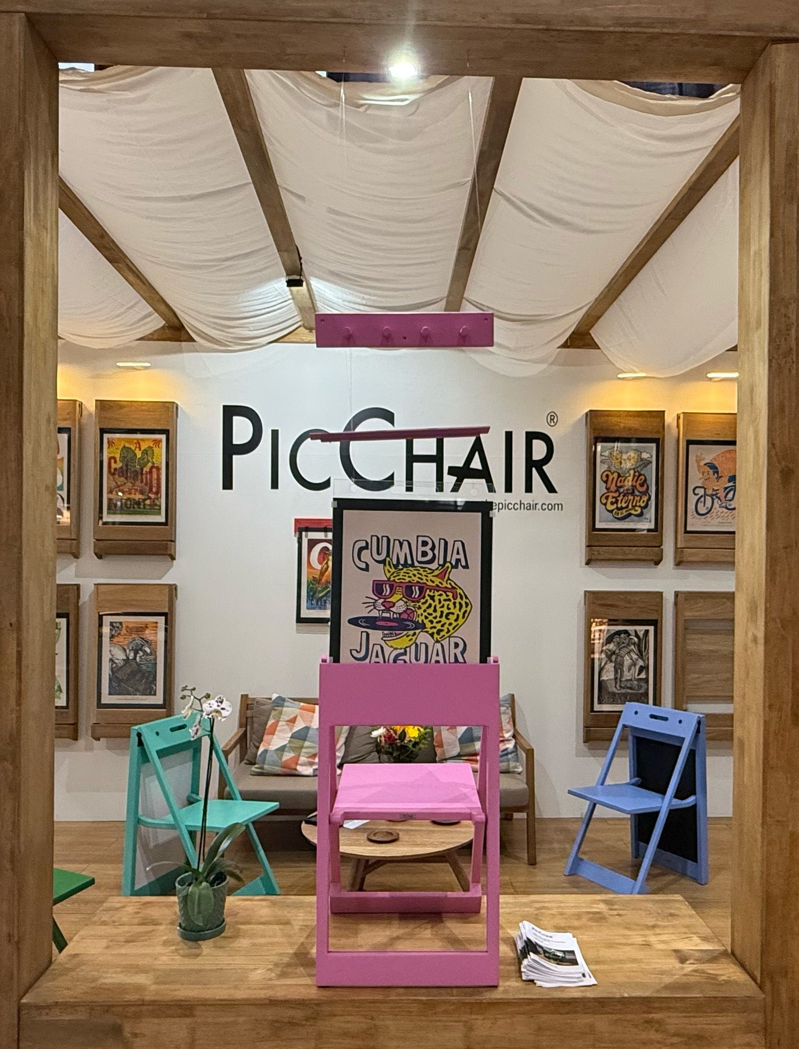 Introducing the PicChair®—a patented, versatile, and eco-friendly addition to any home or office. Showcase your favorite artwork, poster, or photo on the wall, then effortlessly unfold it into a full-sized, comfortable chair when extra seating is needed. Its elegant design and built-in handle make it ideal for guests or additional seating. Each PicChair® features a 16” x 24” acrylic cover with hanging holes and a handle, a mat board backing to support your art, and a pegboard that allows you to hang the chair, display artwork, or store guest coats. Crafted for modern living, the PicChair® combines clever design with a delightful surprise.